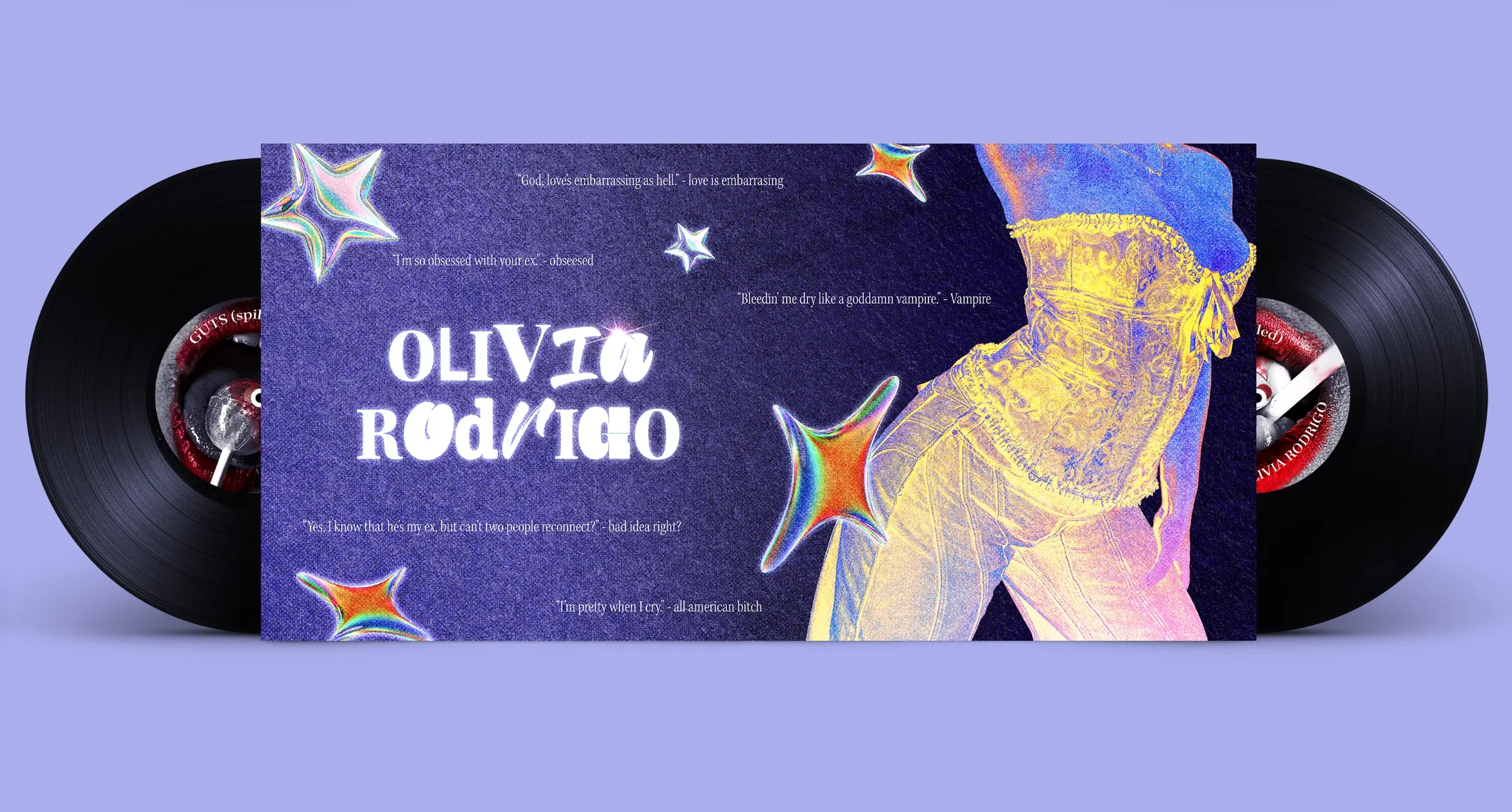 This project reimagines Olivia Rodrigo's GUTS (spilled) album with a new visual direction inspired by Y2K influences, thermal colour treatments, and a strong typographic personality. The aim was to shift the tone of the original imagery while maintaining a clear connection to the album's themes of emotion, intensity, and youth. The work introduces a refined mix of colour, texture, and digital treatments to create a louder and more expressive identity.
